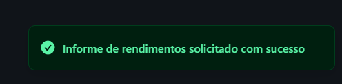 Após a confirmação, uma mensagem de sucesso irá aparecer no canto da tela, confirmando o seu Informe de Rendimentos, que será enviado para o seu e-mail.